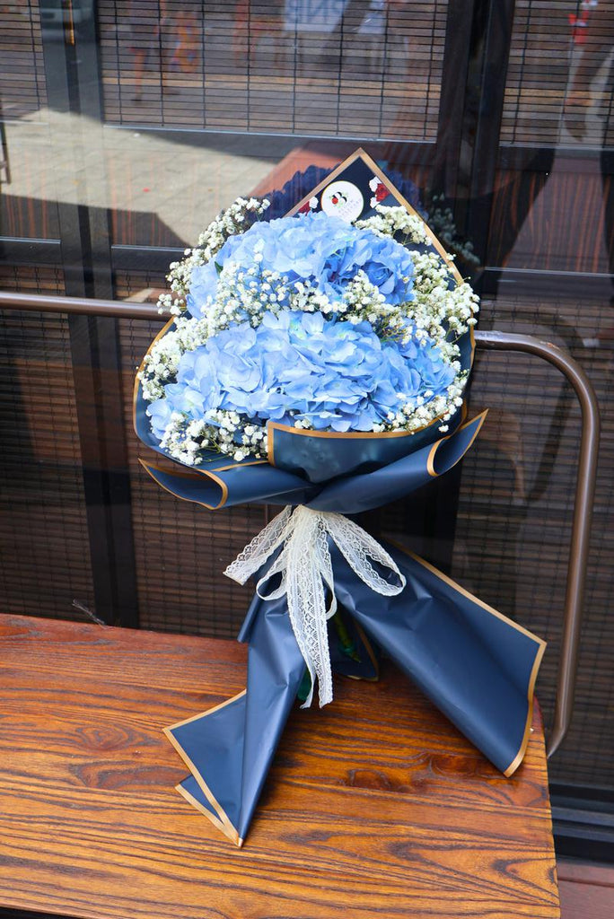 Two lush hydrangeas symbolizing gratitude and abundance, paired with delicate gypsos that embody purity, creating a soft and elegant bouquet.