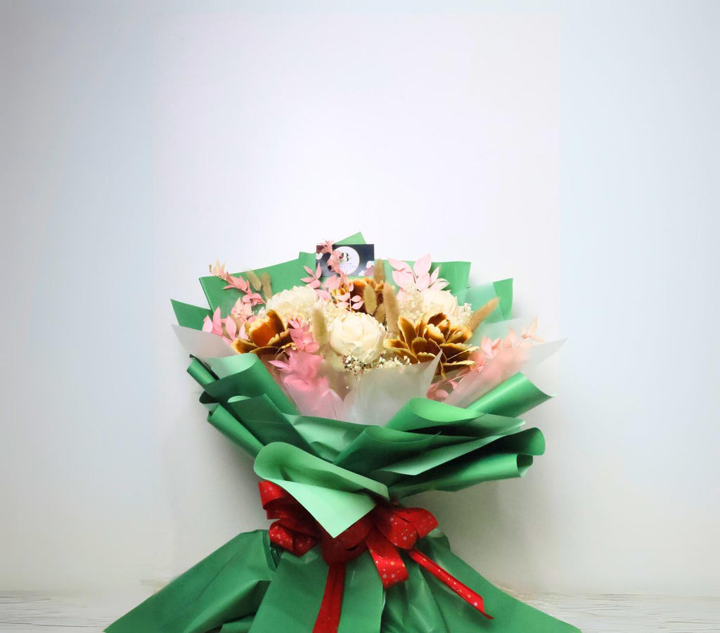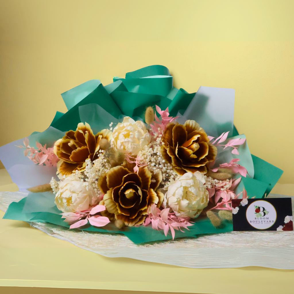 A lasting bouquet of dried flowers symbolizing resilience, paired with artificial peonies for prosperity and roses for love, creating timeless beauty.