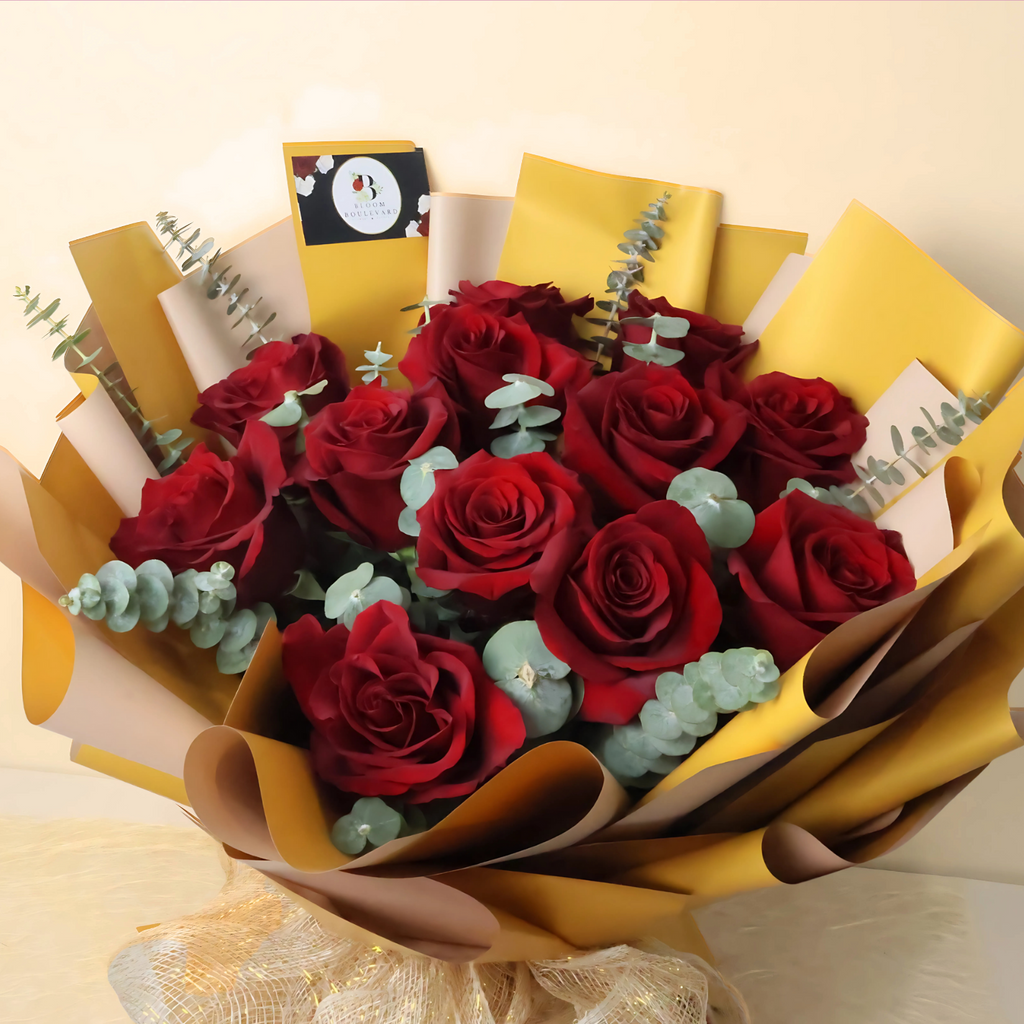 A premium bouquet of 12 Ecuadorian roses, celebrated for their large blooms and long-lasting beauty, crafted to embody pure elegance.