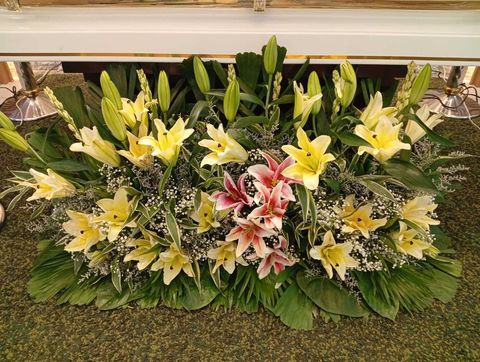 A delicate blend of Easter lilies and Madonna lilies, embodying innocence, renewal, and a graceful farewell filled with light.
