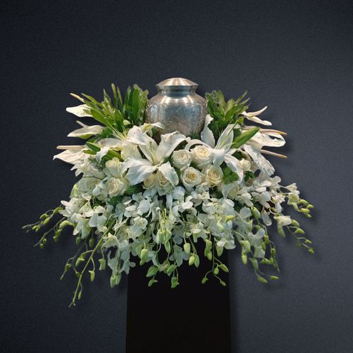 Purity, peace, and eternal love expressed through a refined arrangement of white lilies, roses, and orchids for a heartfelt tribute.