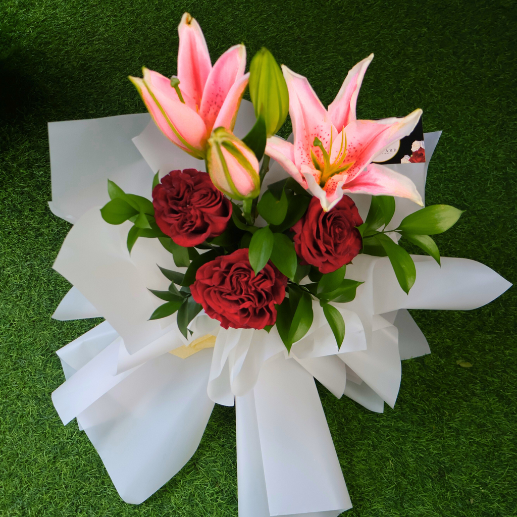 Three luxurious red Ecuadorian roses paired with elegant stargazers and ruscus fillers, a bold bouquet of passion and sophistication.