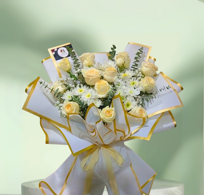 A stunning bouquet of 1 dozen Korean white roses, white mums, and eucalyptus, blending elegance, purity, and freshness.
