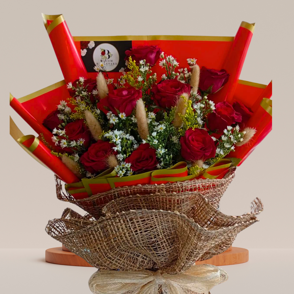 Twelve classic red roses accented with fluffy bunny tails, a stunning mix of passion and contemporary charm.