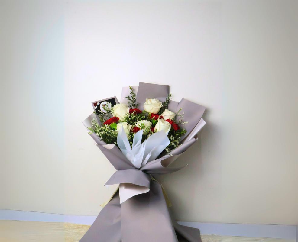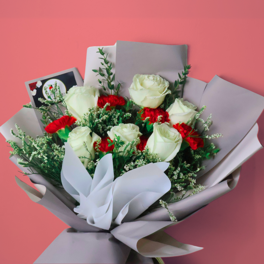Six white Ecuadorian roses symbolizing purity and devotion, blended with six carnations for admiration, and accented with red eucalyptus for a modern touch.