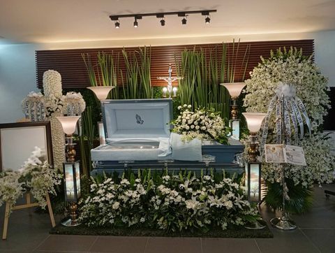 An elegant tribute of white orchids, mums, and lush foliage, reflecting purity of spirit, gentle comfort, and eternal grace.