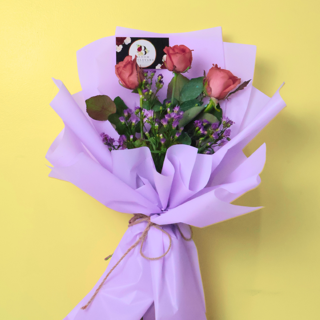 Three pocha pink roses symbolizing grace and admiration, paired with lavender fillers that represent serenity and calm for a heartfelt bouquet.