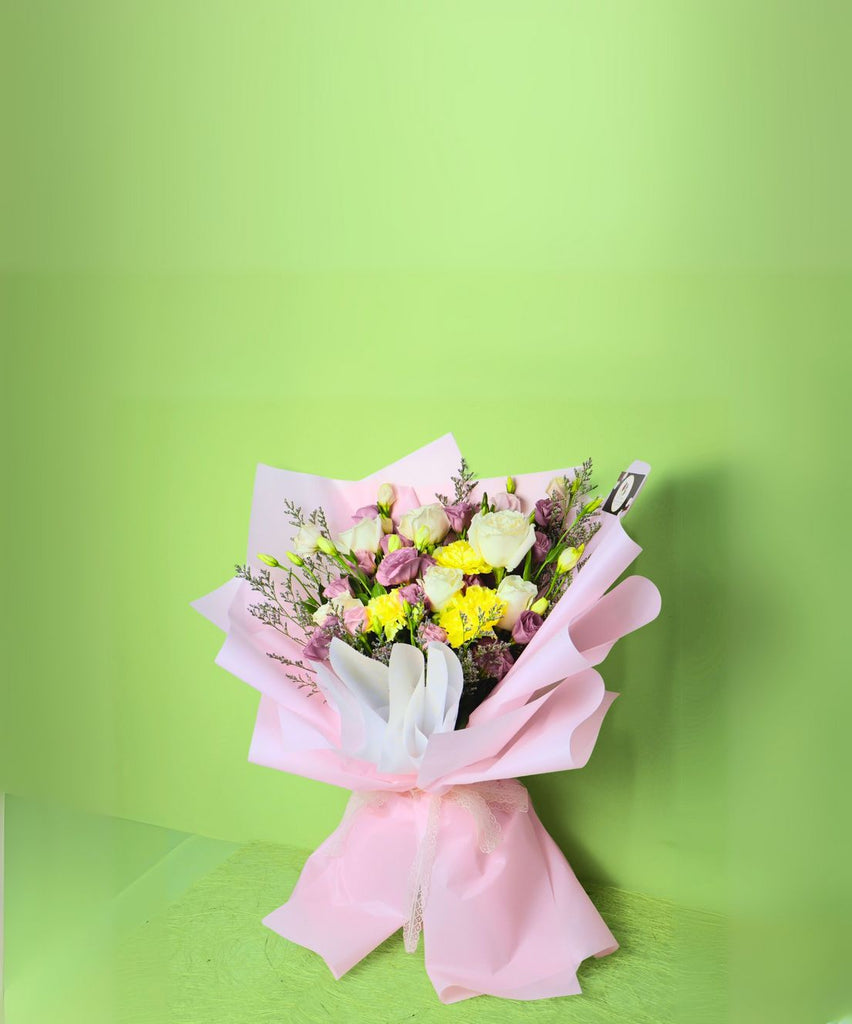 A fresh arrangement of green and yellow carnations paired with delicate lisianthus fillers, symbolizing joy, harmony, and grace.